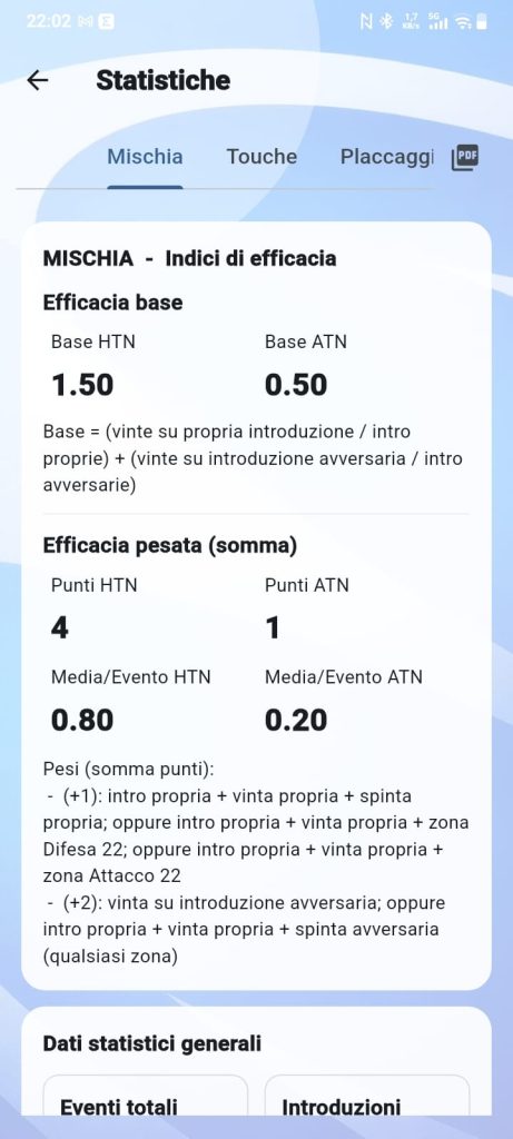 Nella sezione dedicata alle statistiche, con comode tab divise per moduli, l’utente può leggere in tempo reale i dati inseriti e valutare con grafici e numeri l’andamento della partita.